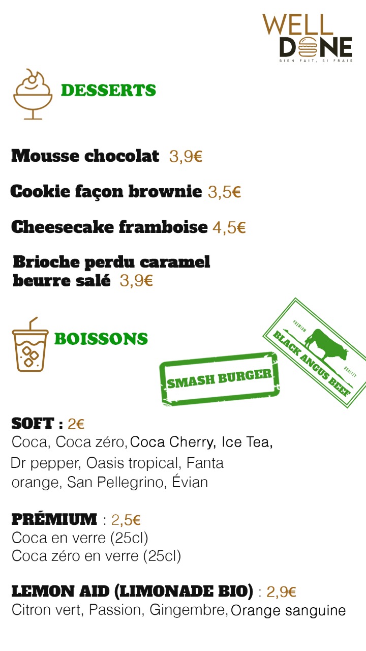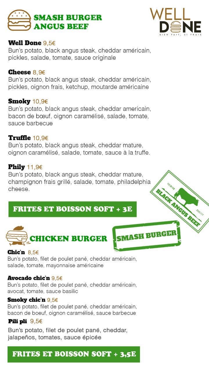 Smash burgers excellents, pour en avoir tester plusieurs sur Paris et sa région Welldone reste l’un des meilleurs. L’accueil remarquable de la caissière qui prend le temps de détailler chaque recette et mentionne la provenance des produits (très rare généralement dans les établissements type « fast-food »)La qualité des produits, et les recettes fait maison, sont définitivement l’atout de cet établissement. Merci à la jeune fille à la caisse qui nous accueille, à chaque fois, très sympathiquement (même quand nous arrivons à 2min de la fermeture !! :))