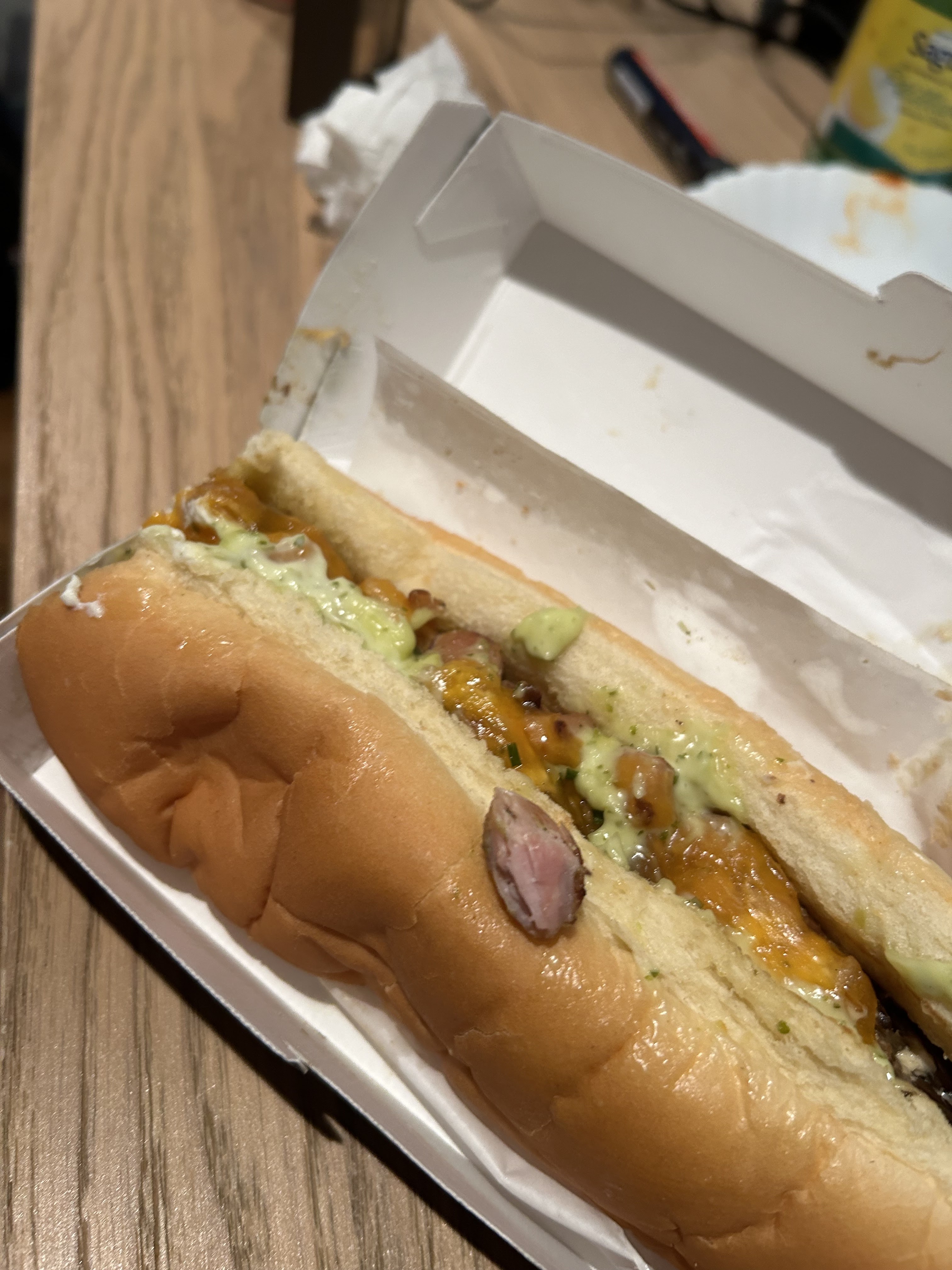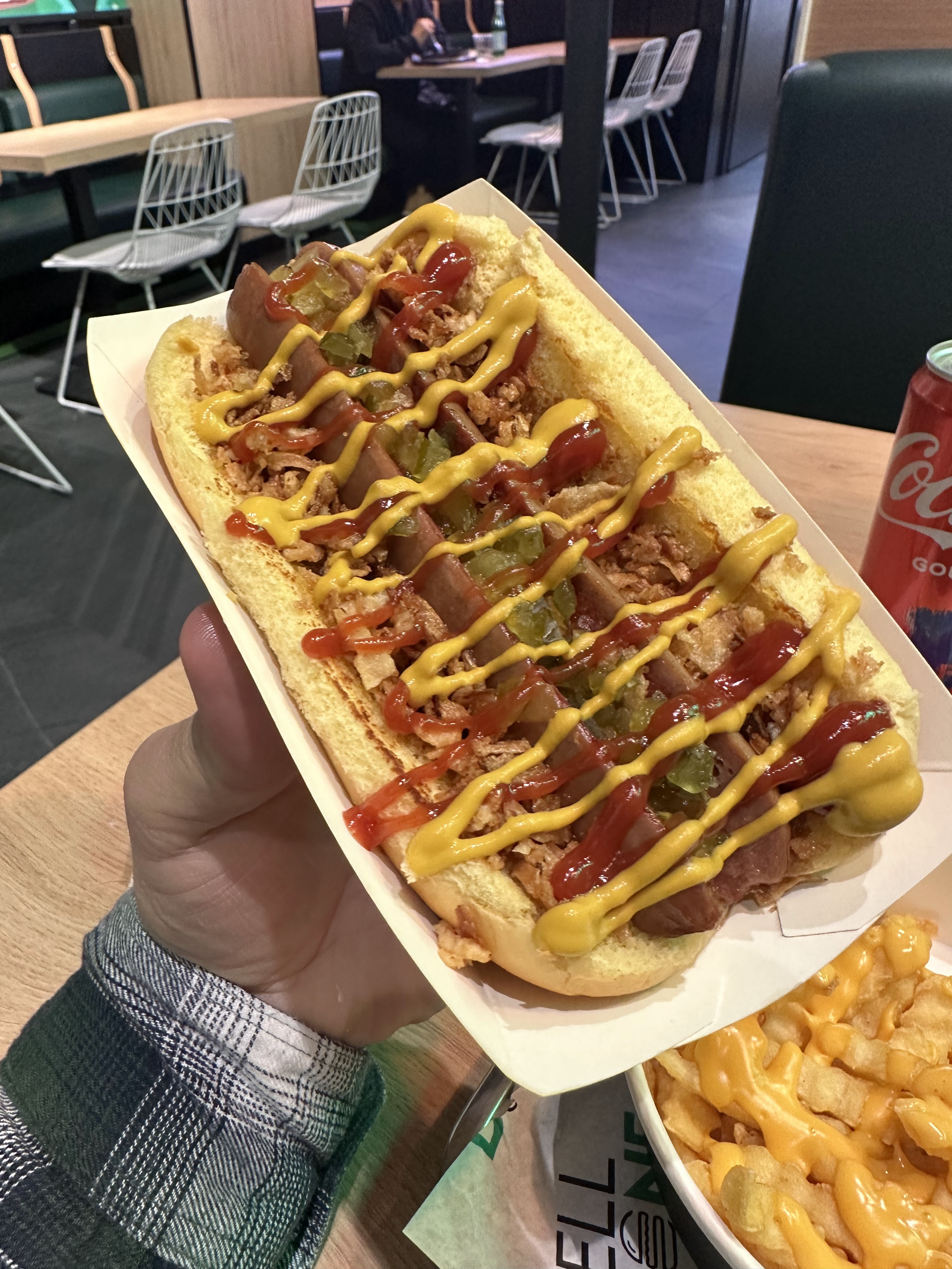 Burgers bons mais petits et ne calent pas du tout. Vous pourrez voir la taille des burgers sur les photos, j’ai mis ma main à côté en comparaison. Dites-vous bien qu’on me dit tout le temps que j’ai de petites mains… les burgers sont faits pour les enfants lol 😅 Les frites sont bonnes mais sans plus. C’est chiant à manger par contre. J’ai pris une fois un hot dog et j’ai été super déçue donc je ne recommande absolument pas. Les 2 fois que nous avons mangé les burgers c’était en livraison donc je ne peux pas noter l’établissement en lui-même, cette note s’applique à leurs produits. En résumé : bof, vous trouverez mieux ailleurs.