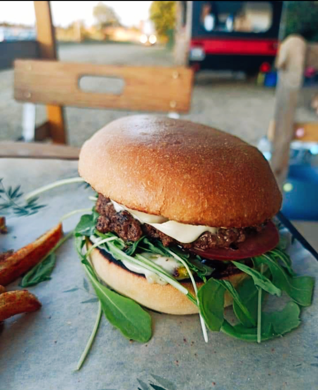 A la sortie du Soler dans un champ... une caravane noire et rouge. Arrêtez vous! Les meilleurs hamburgers du coin. Il ne faut pas être presser sinon passer votre chemin et ne venez pas déguster les Burgers originaux fait maison.