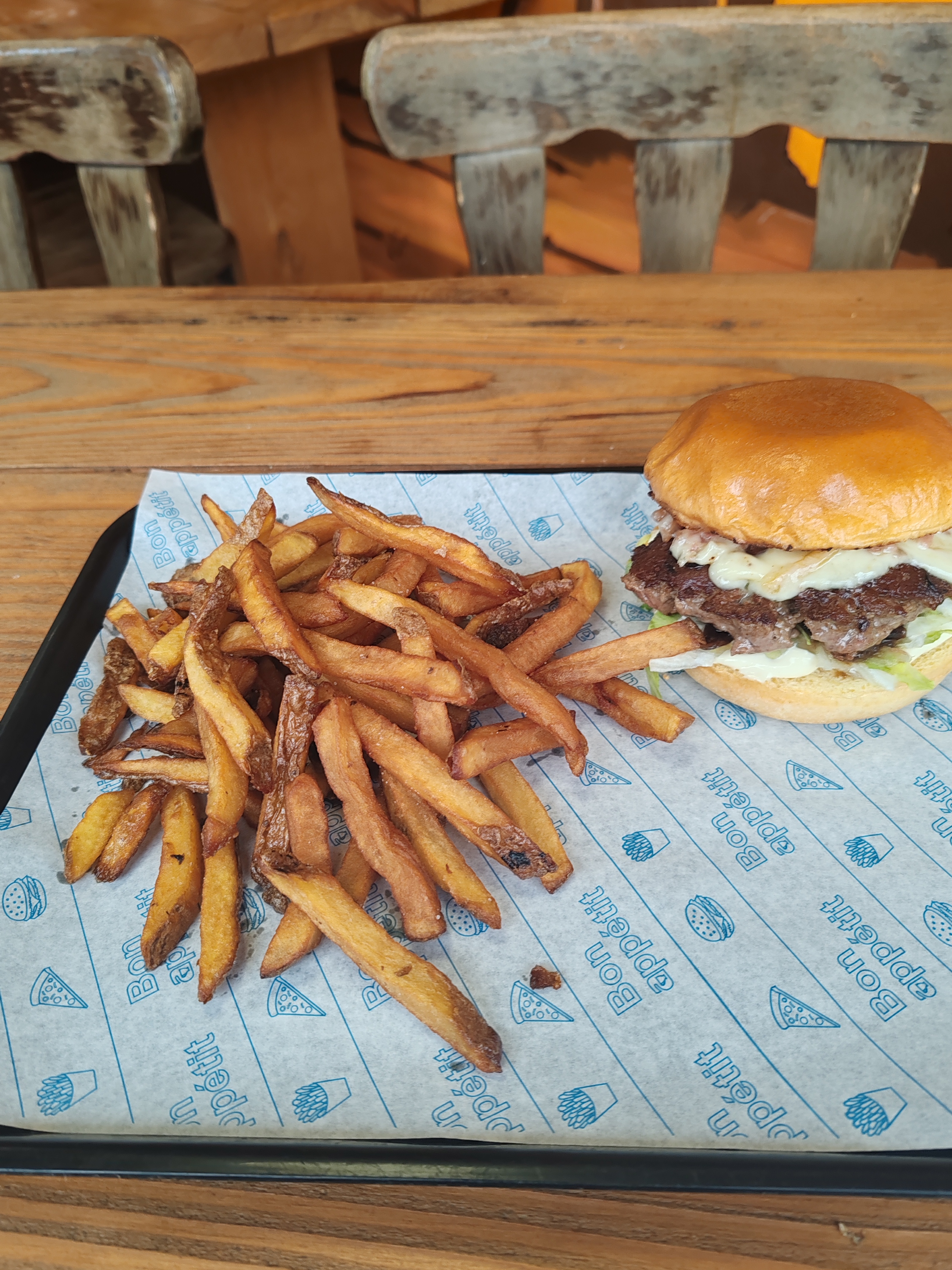 Burger gourmand ! De la viande fraîche ce qui fait toute la différence qui plus est bien préparée. Mon coup de cœur ce sont les frites maison, à la fois croustillantes et moelleuses. Cuisson maîtrisée. Un sans faute pour l’ouverture de ce restaurant avec une ambiance très détendue. Continuez sur cette belle lancée !!!