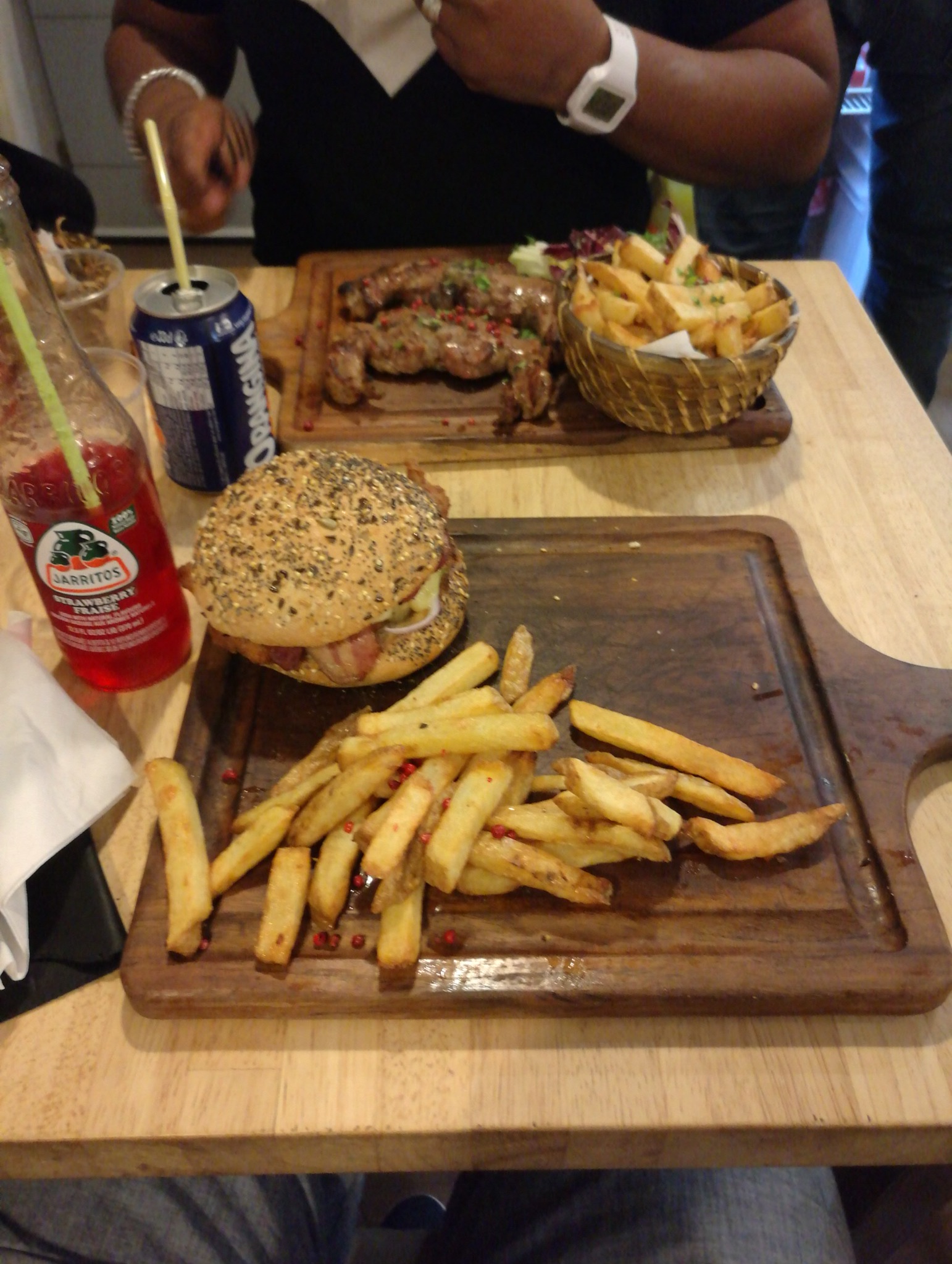 Un fast good différent... Des vrais frites maison des vrai de vrai... Et des hamburgers délicieux dont le zoo a avec un mélange de bœuf agneau avec des oignons rouges et une bonne sauce. Nous nous sommes régalés
